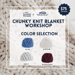 In February, we welcome Twisted Threads as they provide all of the instruction and supplies for you to create your own chunky blanket! Choose your color (blue, cream, grey, or burgundy) at registration. During checkout, please use the notes section to indicate a backup color preference as well as names of other registrants that you wish to sit with.$75 per person & includes a complimentary glass of wine